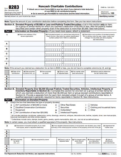 Tax payer should file Form 8283 with tax return for the year tax payer contributed the property or Item in order to claim the deduction. Form 8283 has two section when the tax payer File Form 8283 he/she must complete either Section A or Section B. Section A to report donation of property for which you claimed a deduction of $5,000 or r less per item or group of similar items and Also Section A to report donations of publicly traded securities, certain intellectual property, a qualified vehicle. Section B to report donations of property for which you claimed a deduction of more than $5,000 per item or group of similar items.
